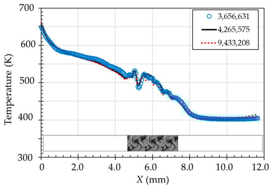Mesh systems at 3.66 × 106, 4.27 × 106, and 9.43 × 106 elements have been generated for the double-wall configuration with the Gyroid design to assess mesh independence at the BR = 1.0. Figure 6 plots the local temperature in the middle of the hot-side surface of the external plate for different mesh numbers. It could be observed that all mesh systems provide almost identical temperature distributions. The variations in the average temperature in 3.66× 106 and 4.27 × 106 elements compared to the 9.43 × 106 elements are 0.29% and 0.18%, respectively.