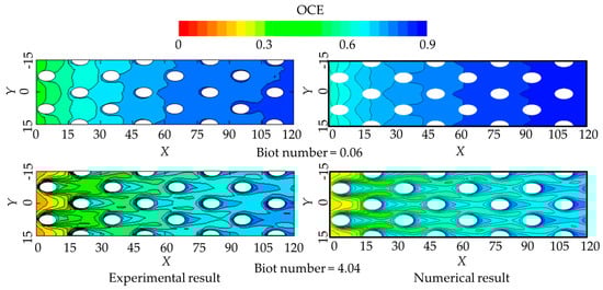 Figure 7 illustrates the comparison of the local OCE obtained from the simulation and the corresponding experimental data at two Biot numbers. The findings reveal a strong correlation between the simulation and experimental results, suggesting that the numerical method employed in this study accurately reproduces the flow and heat transfer characteristics in the unit study of single- and double-wall cooling models.