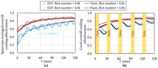 In addition, the cooling effectiveness on the hot-side wall of the film plate at X = 7.5 mm is illustrated in Figure 8b. The simulations show a slight overestimation compared to the experiments for the investigated Biot numbers. Notably, an apparent deviation is observed at 8 mm < Y < 30 mm due to the unsteady flow patterns resulting from the initial interaction between the hot gas and the coolant released from the holes [34,43]. However, the average deviation values for Biot numbers of 0.06 and 4.04 are 4.63% and 5.15%, respectively. In summary, these findings validate the accuracy and reliability of the numerical approach used in this study, as the deviations fall within an acceptable range.