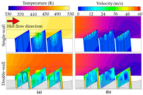 Internal flow characteristics and temperature distributions at the BR of 2.0: (a) Film hole and (b) Gyroid.