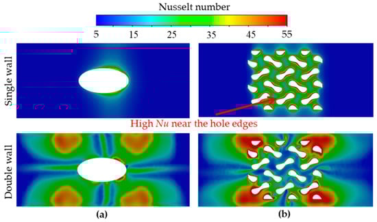 The Nusselt number distributions on the cold-side wall of the external plate for all models at the BR of 2.0 are presented in Figure 10. In single-wall models, large areas of low Nu (Nu < 10) are observed due to the suction effect within the channel. The Gyroid model creates larger regions of high Nu (Nu ≥ 30) compared to the film hole model. Jet impingement significantly increases the Nu at the stagnation zone for double-wall cooling models. As shown in Figure 10a, the film hole model exhibits an expanded high Nu area due to its large wall area and strong jet interaction. In contrast, for the Gyroid network in Figure 10b, the coolant penetrates directly through small holes near the stagnation zones, resulting in high Nu values at the hole edges. However, this effect reduces the intensity of jet interaction, leading to a smaller area of high Nu than the film hole model.
