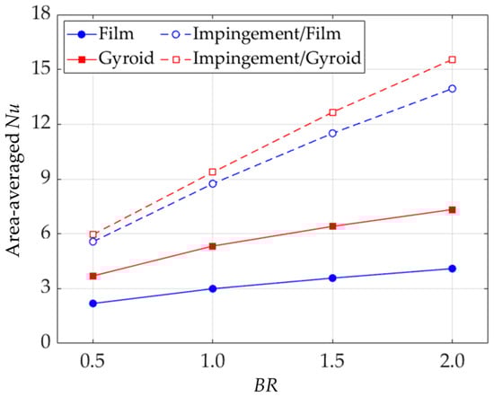 The area-averaged Nu for all models within the studied BR is plotted in Figure 11. Due to additional jet impingement, the average Nu in the single-wall models is lower than in the double-wall models. The film hole causes the lowest value, and all single-wall designs show increased area-averaged Nu as the BR increases. The area-averaged Nu of the film hole is lower than that of the Gyroid models in the single-wall configuration by 69.3–78.8%, as the BR increases from 0.5 to 2.0. Compared to the single-wall configuration, the double-wall cooling with the film hole shows a significantly increased area-averaged Nu by up to 240.2% at the BR of 2.0 due to enhanced internal cooling from jet interaction without negative cross-flow on the internal plate [3]. This interaction disrupts boundary layer development and significantly induces strong turbulence on the cold-side wall, far exceeding the performance of the single-wall design. Meanwhile, the double-wall cooling with the Gyroid enhances the area-averaged Nu by 61.5–112%. However, the area-averaged Nu of the film hole is still lower than that of the Gyroid model in the double-wall configuration by 7.0–11.4%.
