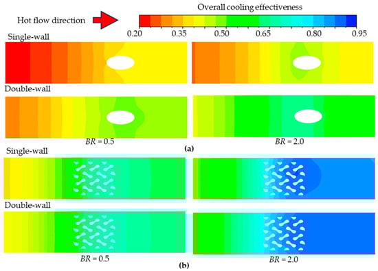 The contours of the OCE on the external wall in all models at the BR of 0.5 and 2.0 are demonstrated in Figure 13. Due to the negative effects of jet lift-off and CRVPs in the film hole model, the contour of the OCE is non-uniform, as seen in Figure 13a. At the BR of 0.5 and 2.0, the jet impingement in the film hole model significantly improves the OCE distribution, especially in the upstream channel. In addition, the contours of the OCE in the Gyroid model are almost identical for both the single- and double-wall configurations, as seen in Figure 13b. Particularly at the BR = 2.0, the contours of the OCE nearly reach the value of 1.0 downstream of the Gyroid networks due to the coolant accumulation and enhanced internal cooling due to the large internal surface area. Also, the small holes in the Gyroid model generate flow mixing, resulting in a uniform distribution of the OCE on the external plate.