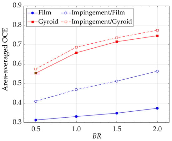 The area-averaged OCE of all models within the studied BR is plotted in Figure 14 for the whole external plate. For all models, the OCE value increases as the BR increases. Although the OCE of the film hole is sensitive to the BR, both the single- and double-wall configurations yield low OCE values in this study. For single-wall cooling, the OCE ranges from 0.31 to 0.37 for the film hole and from 0.55 to 0.75 for the Gyroid model as the BR increases from 0.5 to 2.0, improving 77.4% to 102.7%. Similarly, for double-wall cooling, the OCE is 0.41–0.56 for the film hole and 0.58–0.77 for the Gyroid model, representing a significant increase of 37.5% to 41.5%.