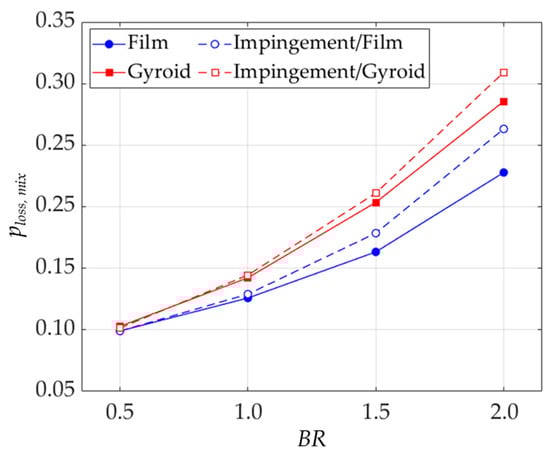 The total pressure loss coefficient is plotted in Figure 15. In each design, the double-wall configuration causes a higher value than the single-wall one. For both single- and double-wall configurations, the Gyroid model causes higher values than the film hole model due mainly to the loss of hot gas flow, where the thick coolant is formed. At the BR of 2.0, the pressure loss coefficient for the Gyroid model is 0.29 and 0.31 in the single- and double-wall configurations, respectively. This represents an increase of 31.8% and 34.8% over the film hole model, which has values of 0.22 and 0.23 under the same conditions.