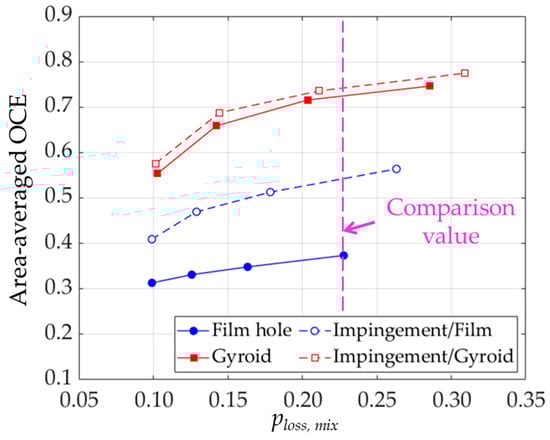 The performance evaluation in this study is observed by plotting OCE against the total pressure loss coefficient, as shown in Figure 16. The jet impingement significantly influences the OCE for the film hole, especially at a higher BR. In addition, incorporating jet cooling has a low impact on the Gyroid model, which can be attributed to their high tortuosities and large hole areas that generate complex flow and significantly reduce the temperature in their pores. At an equal total pressure loss coefficient of 0.23 in all models, the film, impingement/film, Gyroid, and impingement/Gyroid models provide the area-average OCE value of 0.37, 0.54, 0.73, and 0.75, respectively. Therefore, the double-wall configuration with the Gyroid topology shows the best cooling performance in this study, demonstrating 102.7% superior cooling effectiveness than the conventional film hole.