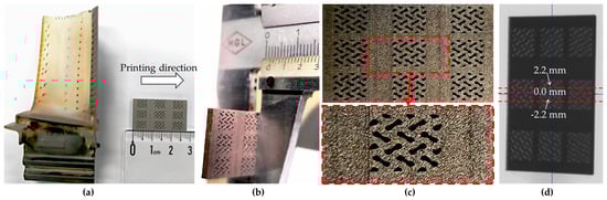 This section evaluates the manufacturability of an additively manufactured Gyroid effusion cooling model, scaled to match a gas turbine blade, as shown in Figure 17. The part is fabricated on a Renishaw AM250 laser powder bed fusion (LPBF) system using Inconel 718 powder with 15–53 μm particle sizes. The process parameters included a 200 W laser, an 80 μm beam diameter, and a 30 μm layer thickness. The printing direction is indicated in Figure 17a. After fabrication, the specimen is separated from the build platform via wire cutting.