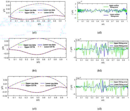 To illustrate the CST reconstruction quality, Figure 2 compares the original coordinate datasets and the CST-fitted curves for the three baseline airfoils. For the transonic, supersonic, and hypersonic airfoils, subplots Figure 2(a1,b1,c1) show the scattered original points together with the reconstructed surface, while Figure 2(a2,b2,c2) display the corresponding pointwise fitting errors. The CST representation matches all three geometries closely, the maximum fitting deviation is below 0.05% of the chord, ensuring that the CST representation retains the essential curvature characteristics of the reference shapes, including the “S-shaped” lower surfaces of supersonic and hypersonic airfoil.