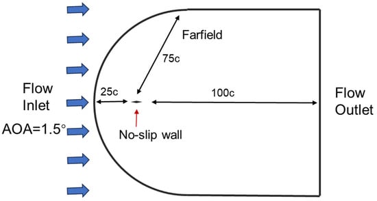 A two-dimensional C–H-type structured grid is generated, extending 20c upstream, 100c downstream, and 75c toward the oblique far-field boundary, as shown in Figure 4. The inflow Mach number is fixed at Ma = 0.8 or 2 for the constant Mach cases, and follows the prescribed acceleration schedule in Case 2. The angle of attack is set to 1.5°. Far-field boundaries use characteristic-based conditions, while the airfoil surface is treated as an adiabatic no-slip wall. This setup ensures numerically stable and physically consistent simulations across all considered Mach regimes.