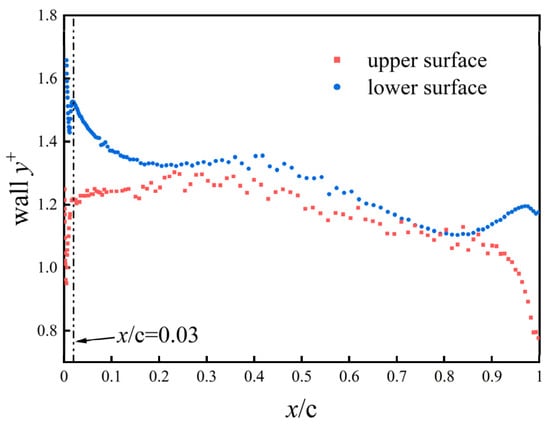 As shown in Figure 5, the C–H-type structured grid is constructed based on a representative supersonic condition at Ma = 2 and employs local refinement around the leading edge, trailing edge, and anticipated shock regions to accurately resolve steep pressure gradients. Near-wall prism layers are generated with a first-layer height of approximately 4.2 × 10−6 m, resulting in wall values close to unity over the main aerodynamic surface. This near-wall resolution ensures adequate capture of viscous effects and shock–boundary-layer interaction (SBLI). The Ma = 2 condition is chosen as the reference case because it represents a typical supersonic regime in which both shock resolution and near-wall viscous accuracy are required. The same near-wall meshing strategy is applied across all Mach number regimes to maintain consistent viscous and shock-resolution characteristics.