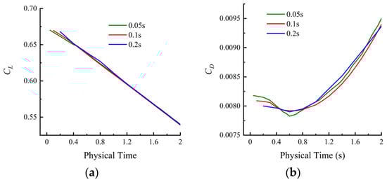 Mesh deformation is handled using the RBF dynamic mesh method [35] implemented in STAR- CCM+2022.R1 [36], which smoothly propagates boundary displacements through the interior mesh without cell distortion. The flow field is solved using the URANS equations [24] with the SST turbulence model [37] and second-order spatial and temporal discretization. As shown in Figure 7, the lift coefficient and drag coefficient histories obtained with Δt = 0.05 s, 0.1 s, and 0.2 s nearly overlap throughout the morphing process, indicating that the time integration is sufficiently converged. Considering both accuracy and computational efficiency, Δt = 0.1 s is adopted for the unsteady simulations.