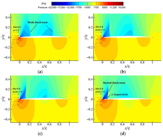 Figure 8 presents the pressure contours at four morphing instants (, , , and ) during the transition from the transonic airfoil to the supersonic airfoil at Ma = 0.8 and α = 1.5°. Although the freestream Mach number is subsonic, local acceleration over the upper surface produces a transonic pocket whose suction intensity increases progressively with time, the lower surface remains under positive pressure. The upper-surface flow evolves markedly: at a broad low-pressure region with a weak shock prevails, benefiting from the transonic airfoil’s blunter leading edge that delays shock formation; at , this is replaced by a distinct normal shock and a weak λ-shaped system near .
