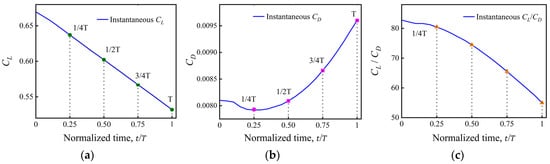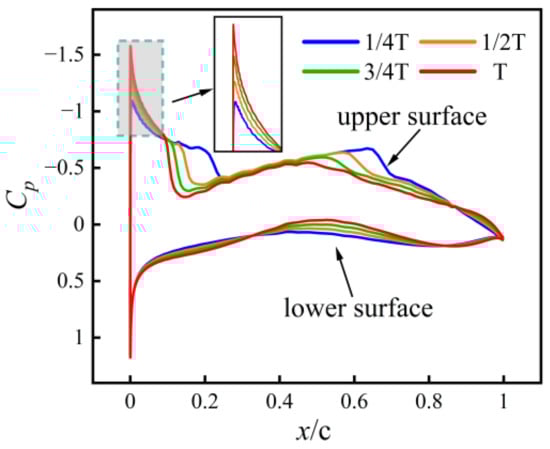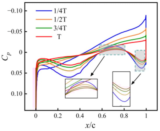 The evolution of the surface pressure coefficient () across the four morphing instants is shown in Figure 9 (suction plotted upward). As the airfoil deforms, three key changes emerge. The suction peak on the upper surface intensifies slightly and shifts forward, while the pressure distribution on the lower surface remains nearly invariant. Consequently, the area enclosed between the upper and lower curves contracts progressively with t/T increases, signaling a steady loss in net lift. The initial configuration () delivers the most favorable aerodynamic state, characterized by strong yet smooth suction and the weakest adverse pressure gradient.