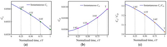 Figure 10 quantitatively illustrates the evolution of aerodynamic characteristics during the airfoil morphing process at Mach 0.8. As the airfoil transitions from a transonic configuration to a supersonic configuration, the lift coefficient exhibits an approximately linear decreasing trend with the non-dimensional time t/T increases. Within the interval from and , the lift coefficient decreased by 19.4%. This lift loss is directly related to the gradual reduction in the area enclosed by the upper and lower surface pressure coefficient distributions (Figure 9). Concurrently, due to shock wave intensification, the drag coefficient increased by approximately 19%. The combined effect of these two factors resulted in a 28.8% reduction in the lift-to-drag ratio, indicating that the aerodynamic efficiency peaks during the initial phase of morphing, where the transonic configuration is most compatible with the transonic flow field. The high lift-to-drag ratio at the early morphing stage is mainly attributed to a low-drag interval, where decreases to approximately 0.0078 while remains moderate at about 0.63. This behavior is associated with the strong sensitivity of transonic shock structures to geometric variations, and is further facilitated by the relatively thin airfoil section (), which is favorable for reduced wave-drag penalties. These results highlight the high sensitivity of transonic flow fields to geometric parameter variations: under the fixed Mach 0.8 condition, even slight changes in airfoil geometry can trigger drastic alterations in the pressure field and aerodynamic coefficients.