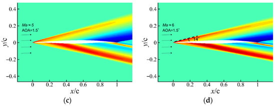 At Mach 2, the streamlines decelerate sharply under the influence of the leading edge oblique shock, accelerate as they pass through the Prandtl-Meyer expansion fan, and then decelerate again at the trailing edge shock, forming a coherent “compression–expansion–recompression” cycle. This characteristic is also reflected in the vorticity field (Figure 21b): the strong shear layers perfectly coincide with the shock locations. Well-defined boundary layer vorticity layers with opposite signs form on the upper and lower surfaces of the airfoil, which merge downstream in the wake region into a stable horizontal vorticity band.