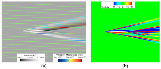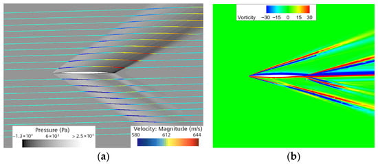 Figure 17 presents the streamlines and vorticity visualization at Ma = 1.1, α = 1.5° with a grayscale pressure background. The background shading is shown only for reference, while the analysis focuses on the colored streamlines that indicate the local velocity magnitude. A distinct detached bow shock wave is observed upstream of the leading edge. The streamline above the surface deflects upward after passing through the shock wave, aligning its direction closely with the geometric contour of the upper surface. In contrast, the streamline below the surface deflects downward, with the flow approximating a nearly straight path. Further away from the airfoil, the streamlines gradually recover the freestream direction. Color variations along the streamlines indicate a local deceleration–acceleration pattern on the upper surface of the airfoil and a milder deceleration–acceleration–deceleration sequence on the lower surface.