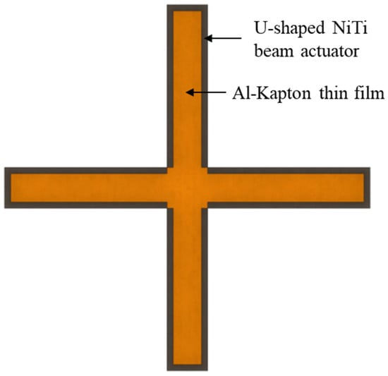 To enable effective modulation of solar radiation pressure, this section proposes a novel solar sail architecture based on Al-Kapton composite films actuated by U-shaped NiTi elements exhibiting the TWSME. The conceptual design adopts an X-shaped configuration composed of four independently controlled rectangular sail segments, as illustrated in Figure 1.