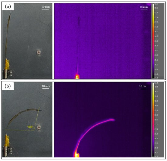 To comprehensively show the electro-thermal driving process, a FLIR A655sc infrared imaging instrument was employed for characterization of the reconfiguration process. Originally, the solar sail was flat without any power, and the temperature across the sail was measured to be around 25 °C, as seen in Figure 13a. Then, out-of-plane morphing occurred once a current of 0.5 A was applied, and the balanced temperature on the solar sail was up to 81 °C. The bending angle of the 80 mm long solar sail prototype was measured to be 108°, or a curvature of 23.56 m−1, which proves a good agreement with the finite element results (22.47 m−1). Infrared imaging of the electro-thermal actuation process of the solar sail is shown in Supplementary Video S1, which demonstrates the reconfigurable capability of developed solar sails.