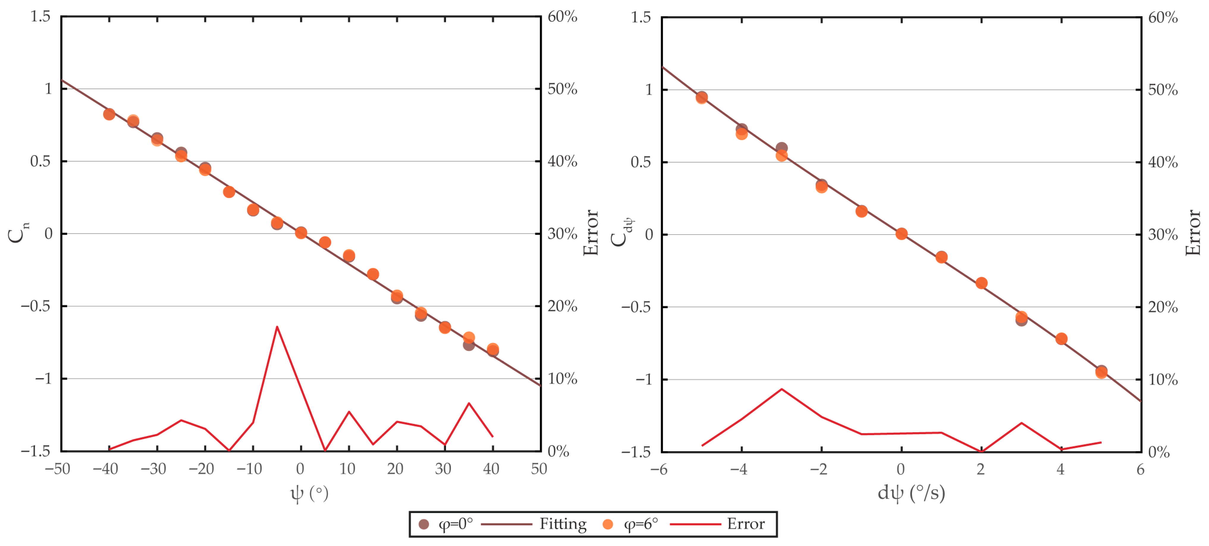 The results indicate that under the 6° roll condition, the relative errors of both the yawing moment coefficient and the yaw damping coefficient are generally within 5%. Although the maximum relative error (18%) occurs at a yaw angle of −5°, the corresponding absolute error is only 0.011, which has a negligible effect on the overall fitting accuracy. This anomaly primarily arises from the small baseline value under this operating condition, which significantly amplifies the relative error. Based on the above analysis, it can be concluded that within the small roll-angle range , the yawing moment and yaw damping coefficients of the tethered aerostat are insensitive to variations in roll angle and can therefore be approximated as M(φ) = 0.