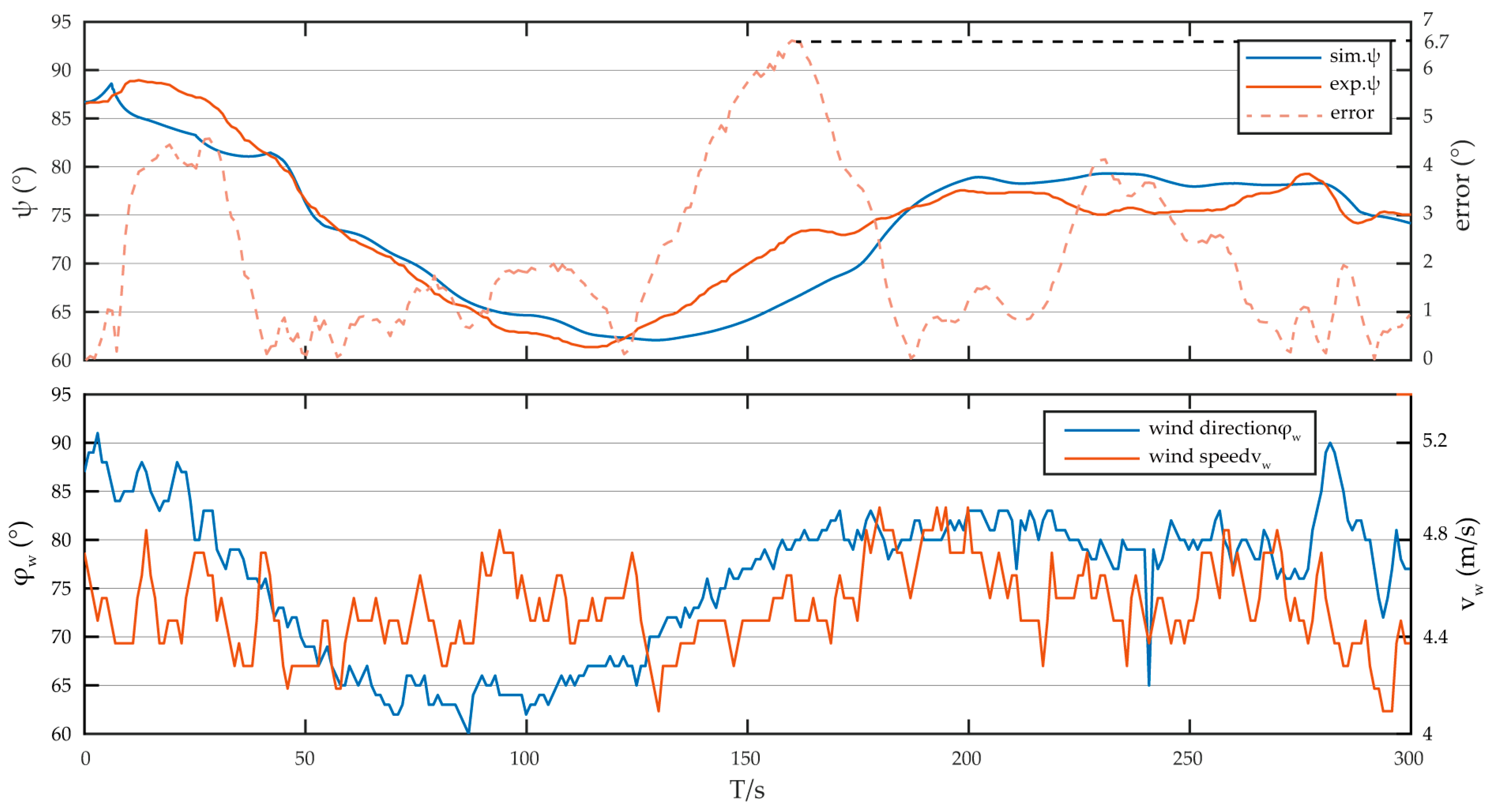 Figure 6. The comparison shows that the simulation curve is consistent with the experimental data in terms of overall trend; the simulated response oscillates around the experimental curve but exhibits a noticeable phase lag. During the initial stage (0–100 s), the simulation and experimental curves match closely; thereafter, the simulation gradually lags behind the experimental data, reaching a maximum deviation of −6.7° at 162 s. The mean absolute error (MAE) of the yaw-angle prediction is 2.16°, and the root-mean-square error (RMSE) is 2.74°. The ratio of RMSE to MAE is approximately 1.29, indicating that the error distribution is close to normal and no extreme deviations occur. The RMSE corresponds to about 9% of the full dynamic range (approximately 30°).