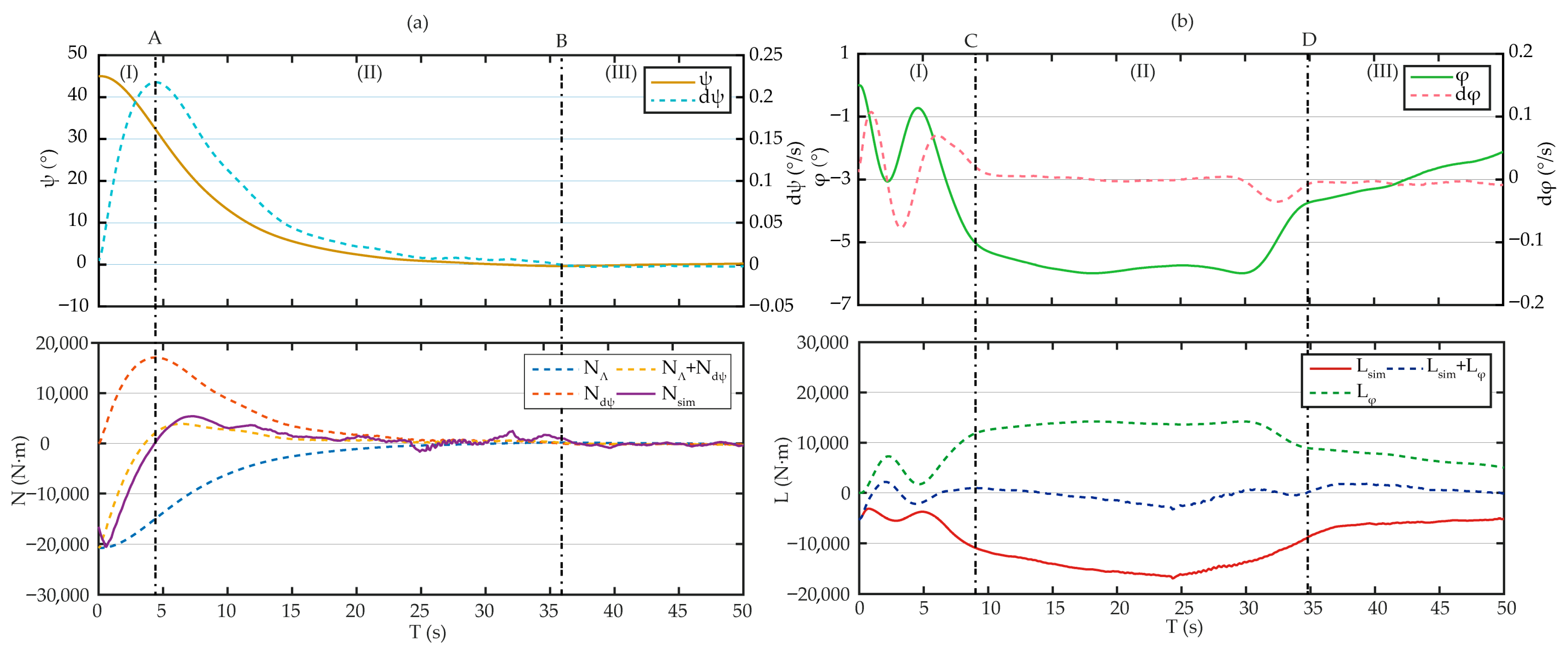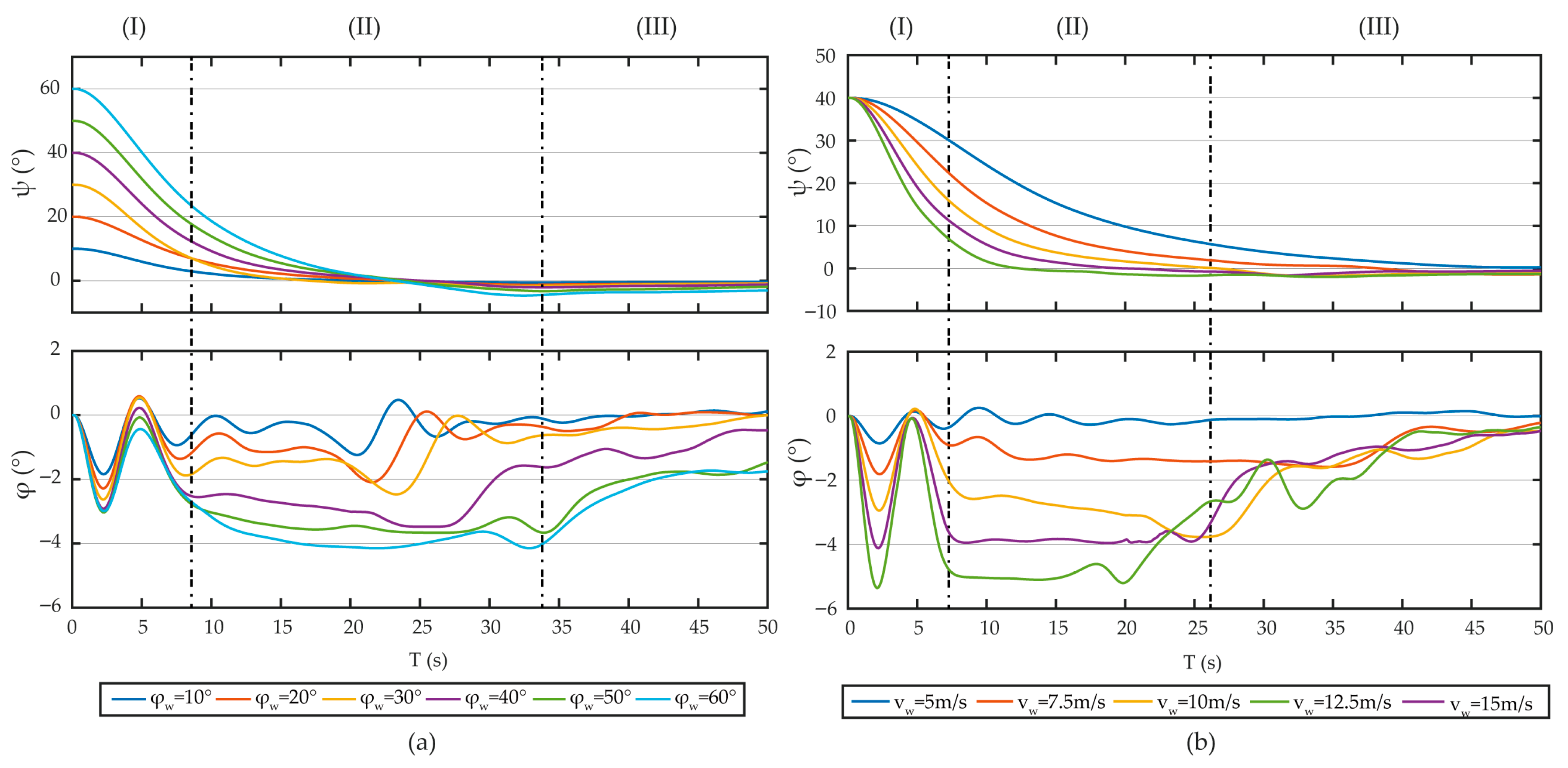 Figure 9, where in (a) the dashed line shows the intersections of the curves with the 0° line, and in (b) the dashed lines indicate the minima and maxima of each curve in Stage (I). Key dynamic parameters were further extracted and analyzed, including yaw angle decay time