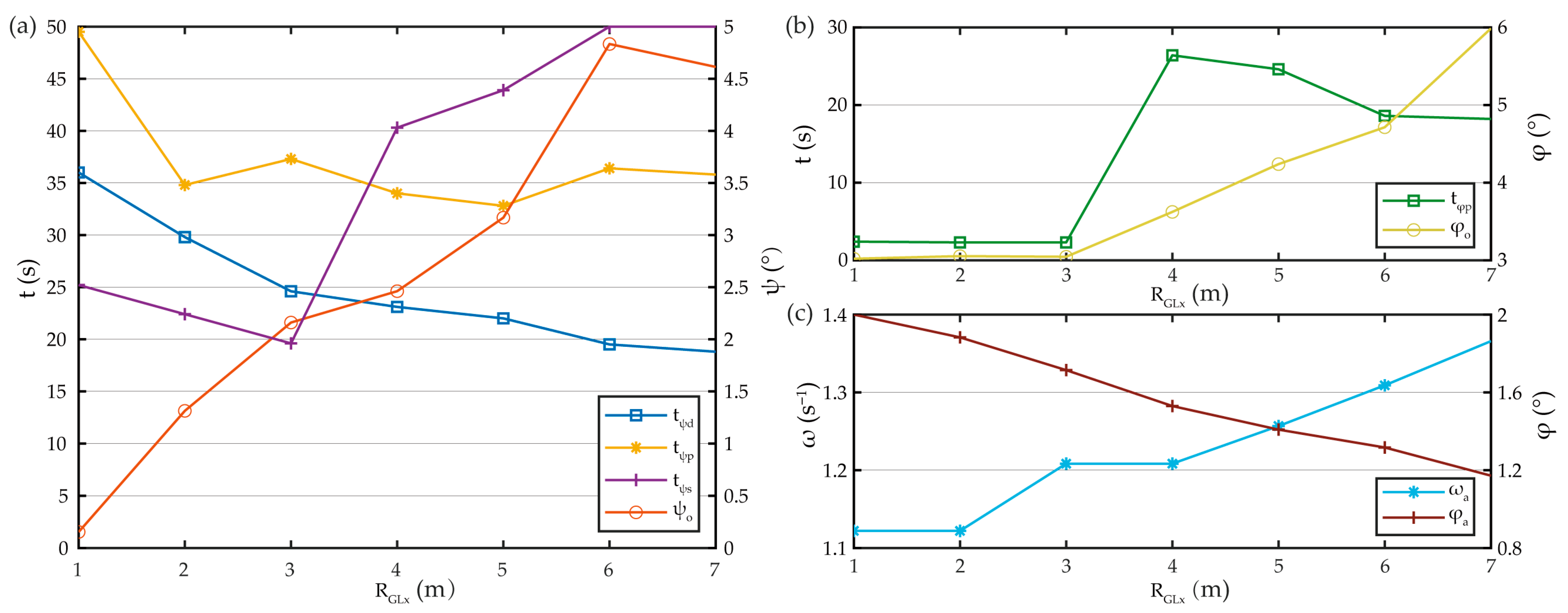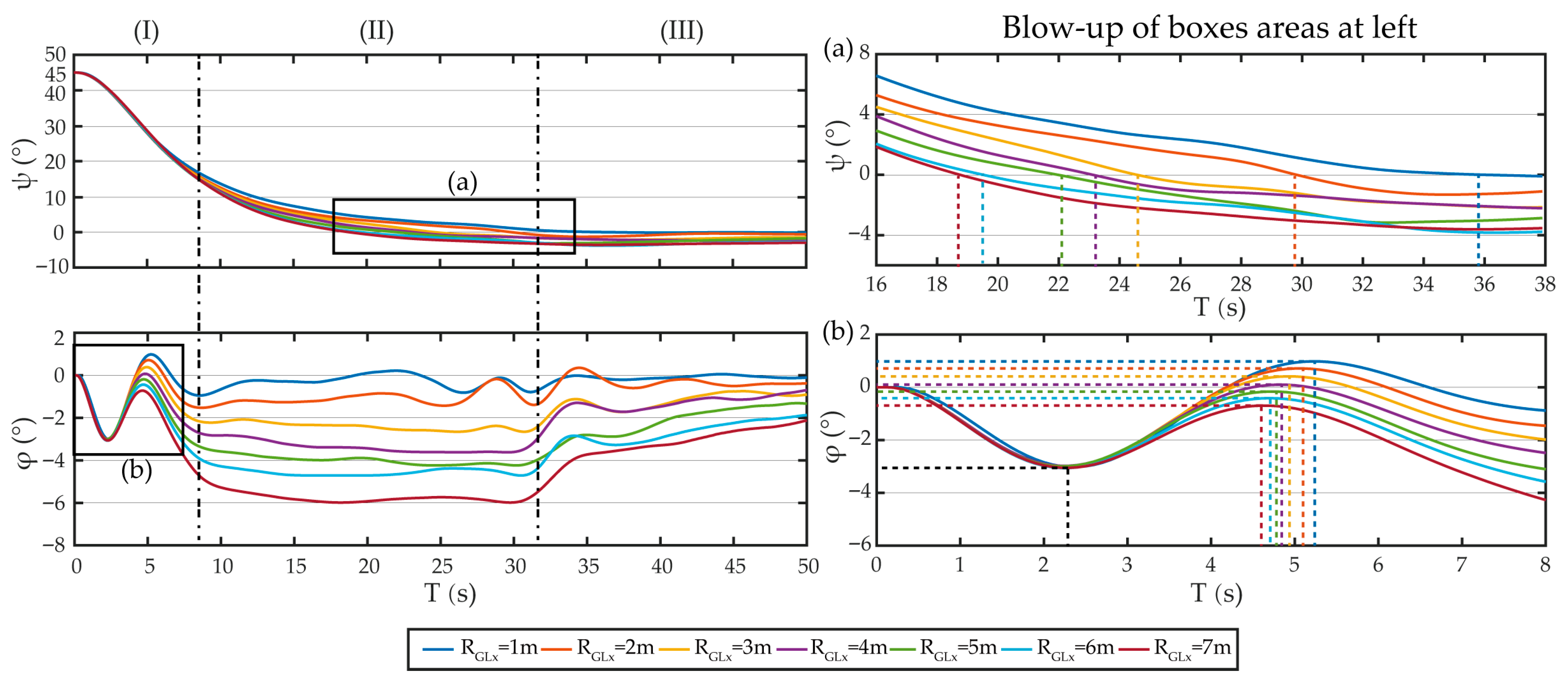Meanwhile, as increases, the roll angle peak also rises significantly. When = 1 m to 3 m, the roll peak corresponds to the oscillation amplitude in stage (I). However, when = 4 m, the peak exceeds this stage’s oscillation amplitude, leading to a sudden increase in the peak time , which then gradually decreases with further increases in . Moreover, during stage (I), the roll oscillation frequency increases with , while the oscillation amplitude decreases, indicating that a larger results in smaller amplitudes and faster oscillations—an unfavorable trend for the stable operation of the tethered aerostat.