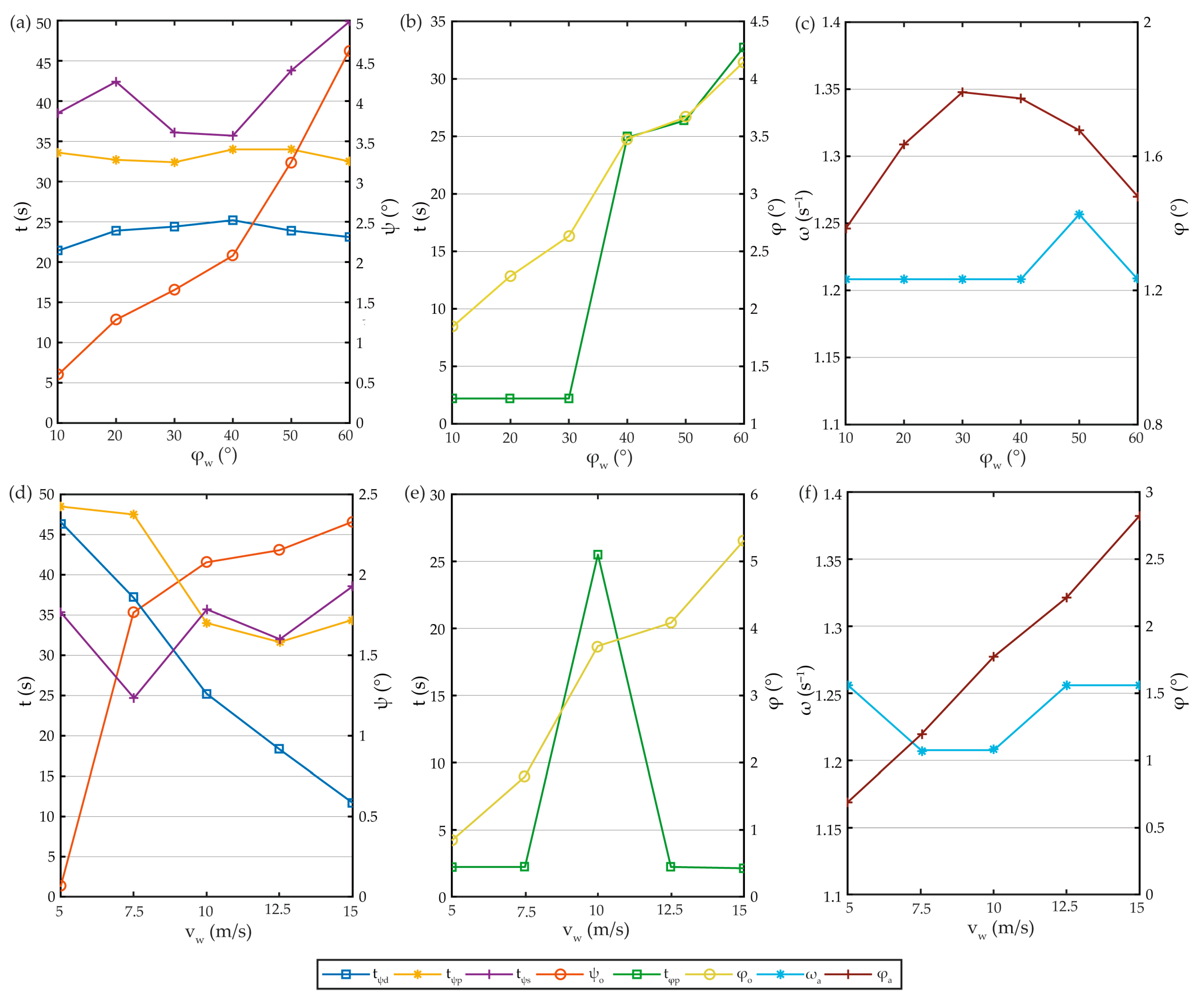 Table 8. All simulations were conducted under consistent initial conditions: pitch angle of 5°, yaw angle of 45°, roll angle of 0°, and inflow velocity of 10 m/s. The obtained yaw and roll angle response curves are shown in