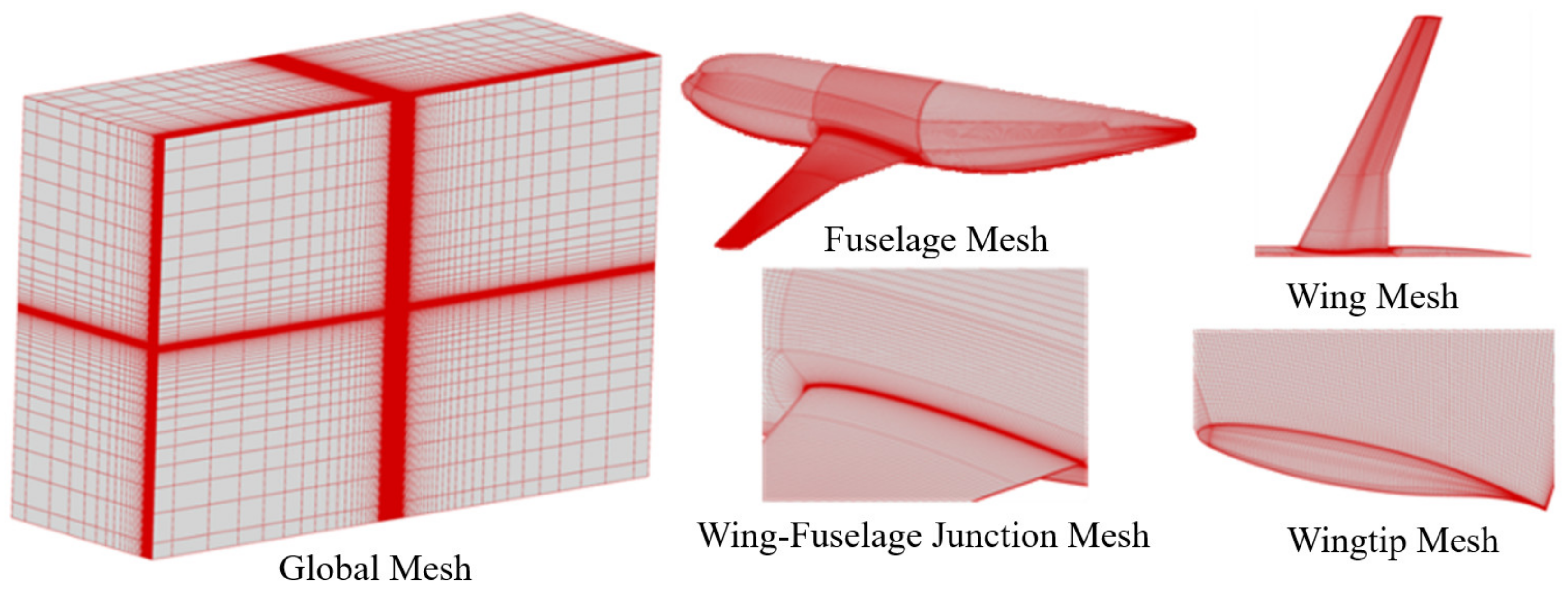 - Li, W.; Meng, D.H.; Hong, J.W.; Li, H. Influence of grid topology on numerical simulation of DLR-F6 configuration. Acta Aeronaut. Astronaut. Sin. 2017, 38, 149–155. [Google Scholar]