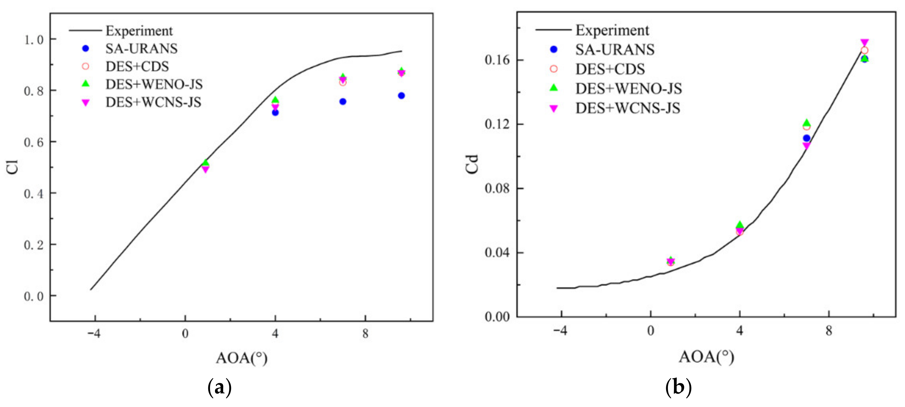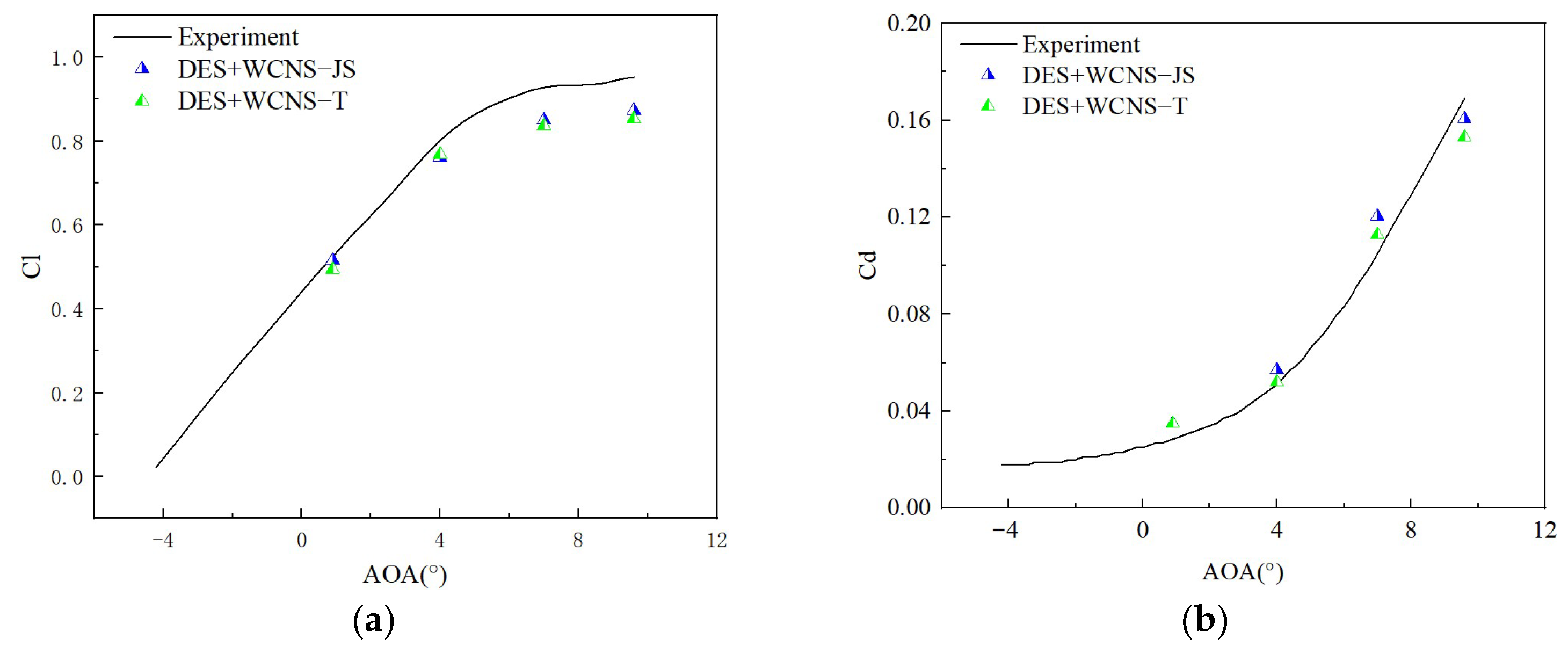 - Zhuo, C.S.; Zhong, C.W.; Li, K.; Xie, J.F.; Zhang, Y. LBM numerical simulation of airfoil flow at high Reynolds number. Acta Aeronaut. Astronaut. Sin. 2010, 31, 238–243. [Google Scholar]