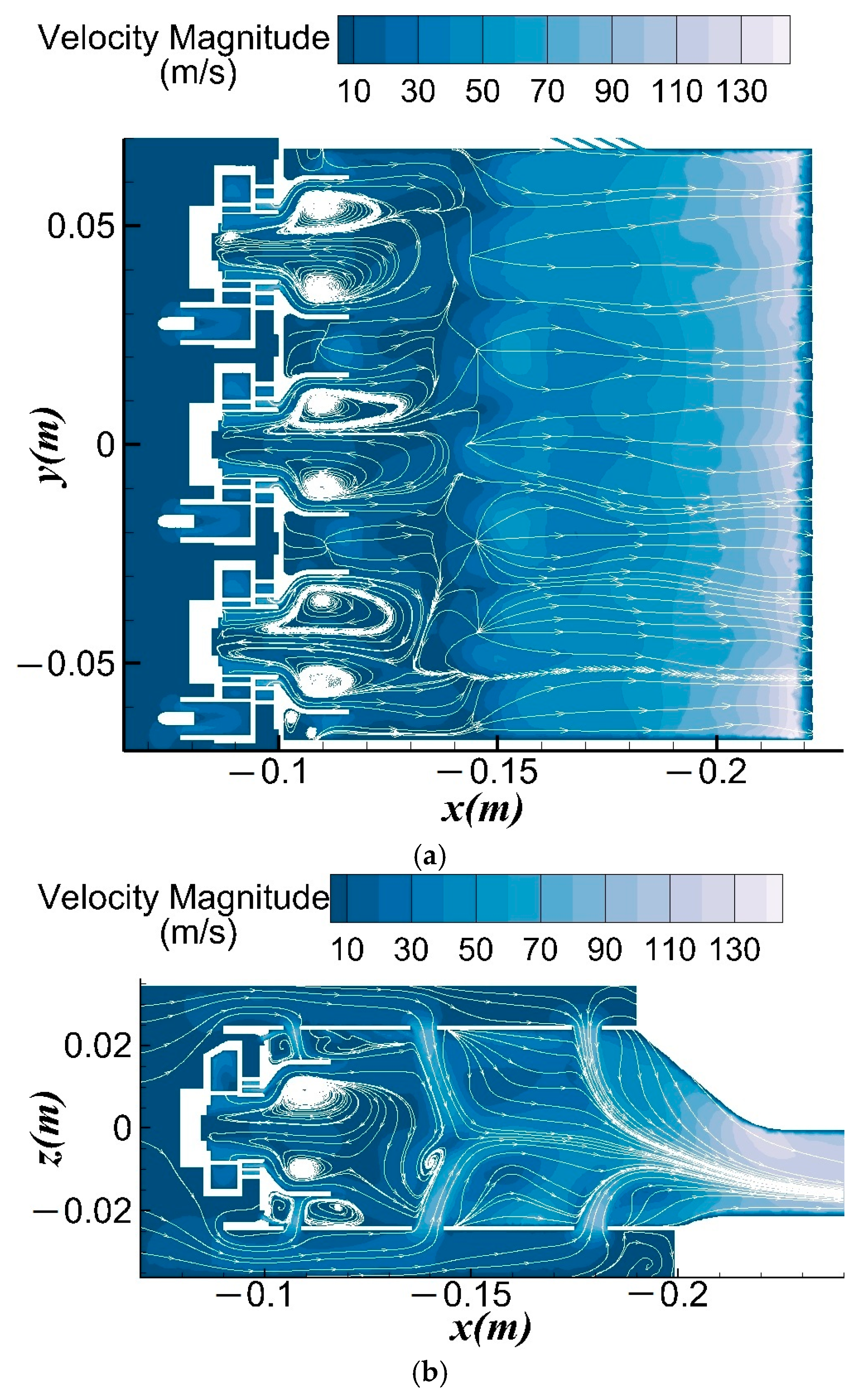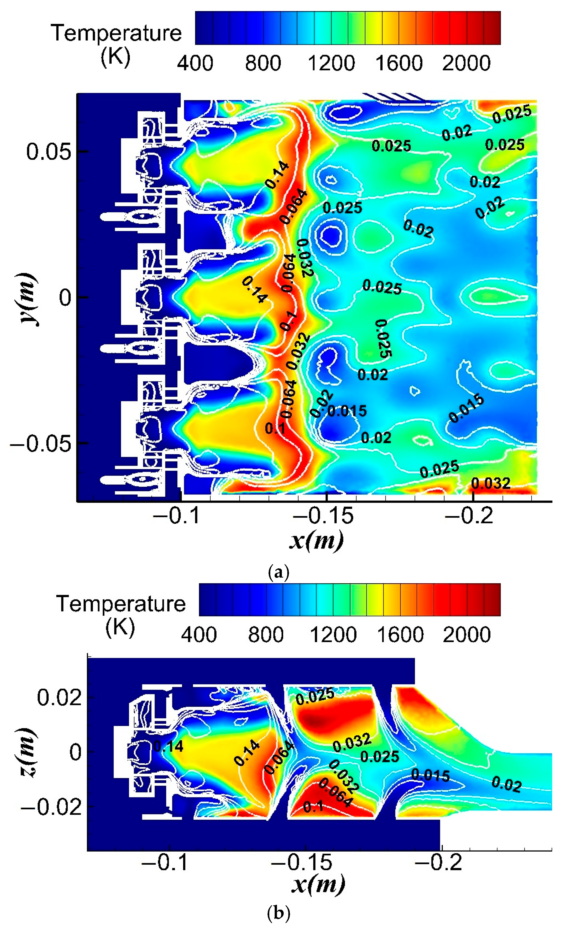 - Wang, M.; Cheng, S.; Song, S.; Chen, Y. Numerical simulation on influence of flow field of combustor inlet on a certain reversed-flow combustor performance. J. Aerosp. Power 2018, 33, 1281–1289. [Google Scholar]