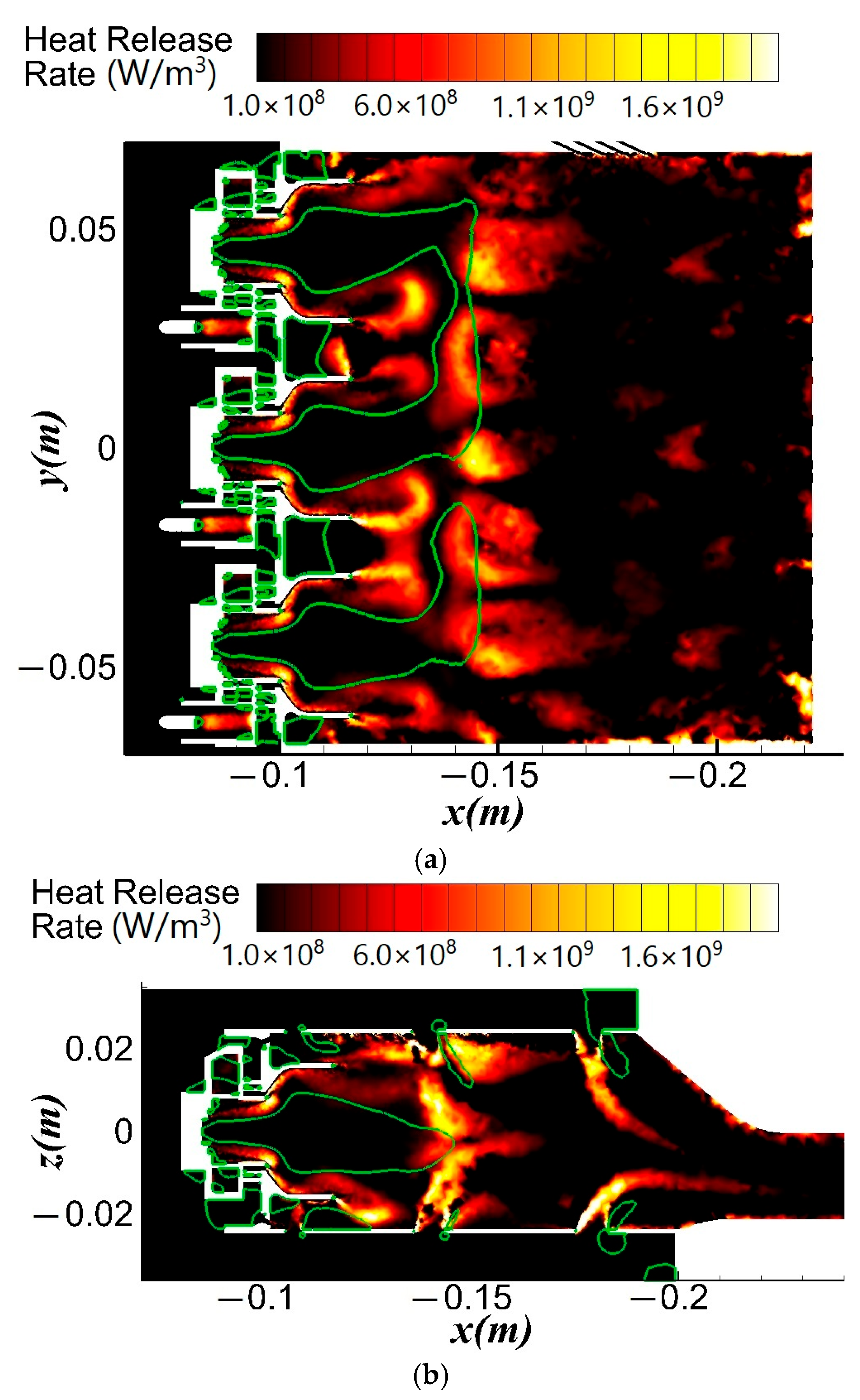 - Zhu, D.-Q.; Wu, P.-L.; Jin, R.-H.; Li, P.-F.; Liu, Y. Numerical Simulation for Influences of Fuel Injection Pulse on Temperature Profile. Aeroengine 2015, 41, 51–56. [Google Scholar]