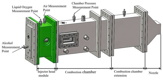 The air heater test rig adopted in this study shares the same core hardware architecture as the subscale model reported in our previous work [34]. This test rig is composed of four key components (Figure 1): a head module integrating the injector and a tripropellant coaxial direct-flow single injector, an optical combustion chamber (equipped with an 85 × 35 mm2 quartz viewing window for flow field visualization via high-speed shadowgraph imaging), an extended combustion chamber, and a tail nozzle. The internal cross-section of the combustion chamber measures 141 × 45 mm2, with the lengths of the first-stage chamber and the extended chamber set to 348 mm and 315 mm, respectively.