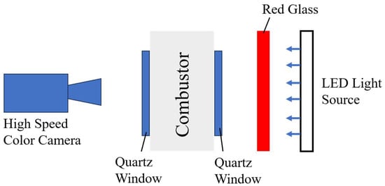 A dedicated optical observation system was built for the test, and its optical path layout is shown in Figure 3. Background light imaging technology was adopted for flow field observation, whose imaging principle is similar to the shadow method, mainly relying on the brightness difference between the background light source and the observation target to generate clear images. The background light uses an LED surface light source (white light), which is converted into red background light by adding a red film filter; the effective light-emitting area of the LED light source is 100 × 200 mm2, and the maximum output power can reach 72 W, which can provide stable and uniform illumination conditions for flow field observation. In addition, to track the dynamic evolution law of the flame during the thermal test, high-speed photography technology was introduced to focus on monitoring key dynamic parameters such as flame structure morphology, development process, and stability characteristics. In the image acquisition process, the blue–green channel of the high-speed camera is specially used to capture flame radiation signals to reflect the temperature distribution and combustion intensity of the flame; the red channel focuses on the extraction of spray images, thereby realizing the synchronous observation of spray and flame characteristics.