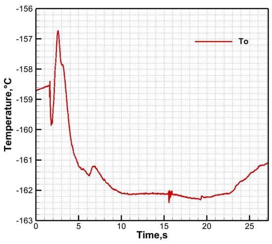 The time-node control scheme for the hot test process is illustrated in Figure 4 (the abscissa in the figure represents the absolute time during the test). Prior to conducting the hot test, considering that heat transfer between the pipe wall and cryogenic liquid oxygen (LOX) as it flows through the pipeline from the storage tank to the air heater can cause partial vaporization of LOX, it is necessary to open the LOX precooling valve in advance to precool the main LOX pipeline. This ensures that LOX maintains a liquid state when entering the combustion chamber. The precooling of LOX is performed in two steps: first, low-pressure precooling of the main LOX pipeline before the ignition sequence; second, high-pressure precooling immediately before ignition during the test. As shown in Figure 5, significant temperature fluctuations occur when LOX initially enters the pipeline between the precooling pre-injection valve and the injector. After 10 s, the LOX temperature stabilizes below −160 °C, following which the hot test ignition is initiated.