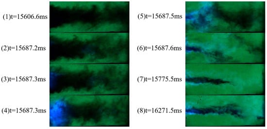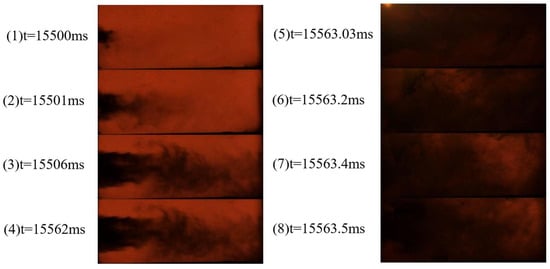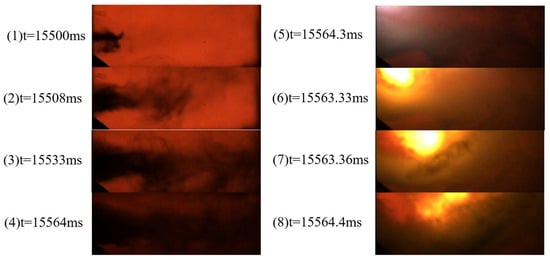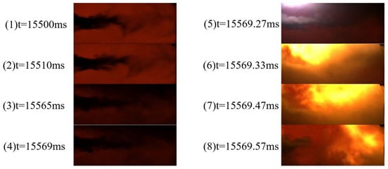 After ignition is triggered, the hot gas injected by the torch igniter rapidly diffuses into the combustion chamber, causing the local ambient temperature to rise rapidly, thereby promoting the violent evaporation of alcohol and liquid oxygen. From the flow field images in Figure 7(3),(4), it can be clearly observed that dense liquid mist has formed in the recirculation zones on both sides of the injector panel outside the observation window, indicating that the mixing degree of fuel and oxidizer is gradually improved. There is a time difference of 69.27 ms in the transmission of the ignition signal. Until t = 15,569.27 ms, as shown in Figure 7(5), an obvious ignition glow first appears in the flammable recirculation zone above the combustion chamber inside the observation window, marking the official start of the combustion reaction. Subsequently, the ignition flame rapidly propagates along the nozzle axis under the drive of the air flow and is ejected outward. The dynamic development process of the flame morphology is shown in Figure 7(6)–(8).