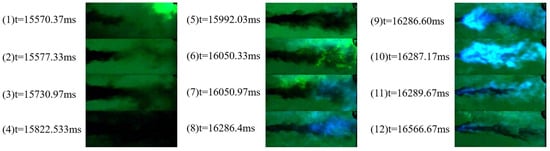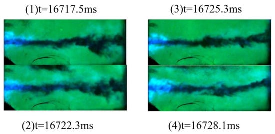 Next, this study conducts an analysis on the ignition flame propagation processes under test conditions I-1 and I-2, with the typical timing characteristics of the two conditions illustrated in Figure 11 and Figure 12, respectively. Taking condition I-2 with the maximum recess depth (10 mm) as the core research object, an in-depth dissection is performed on its ignition flame propagation and combustion stabilization processes. Under this operating condition, flame propagation exhibits a compact evolution characteristic of “rapid ignition at the jet head—continuous flame propagation—ultra-fast combustion stabilization”: Upon ignition initiation, the mixing efficiency between the alcohol jet from the recessed injector and the air flow is significantly enhanced. The hot gas ejected from the torch igniter rapidly mixes with the high-concentration combustible mixture in the recirculation zone, directly forming a blue flame in the viewing window area (Figure 12(2)) and achieving rapid ignition at the jet head (Figure 12(3),(4)). Without undergoing a maintenance stage of low-concentration weak flame, the initial combustion intensity is substantially improved.