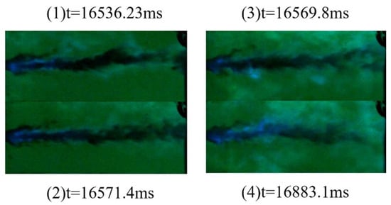 Under the continuous action of the “kindling source”, the combustion chamber pressure and local temperature rise. The sudden temperature rise accelerates the vaporization and evaporation processes of liquid oxygen and alcohol sprays, and the gas–liquid interface becomes blurred due to rapid phase change (Figure 10(3),(4)), forming a large amount of combustible mixture. At the same time, the entrainment effect of the recirculation zone is significantly enhanced, which entrains a large amount of liquid oxygen and alcohol mixture into the combustion zone, making the flame volume in the upper half of the observation window gradually expand. Subsequently, the tail region of the jet spray is successfully ignited by the flame in the recirculation zone, and the flame morphology transitions from dense liquid mist to continuous linear shape (Figure 10(5),(6)). At this stage, the flame color changes from initial yellow to pale blue, and the appearance of the blue flame indicates that the mixing uniformity of ethanol and liquid oxygen is significantly improved, and the combustion efficiency is gradually increased.