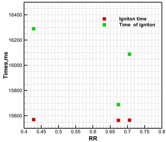 Combined with the analysis of the chamber pressure curves of the three groups of injectors in Figure 16, it can be seen that all three experience pressure build-up, combustion, and pressure relief stages during the entire combustion period. Focusing on the core combustion period (15~18 s), the pressure oscillation amplitude of the non-recessed P0 is about ±0.2 MPa, the pressure curve of P1 is the smoothest with an oscillation amplitude of only ±0.1 MPa, and the injector P2 with deep recess has the highest pressure peak, exceeding 1.5 MPa, reflecting that the larger the recess amount, the higher the combustion intensity, which is prone to combustion instability. The larger pressure fluctuation amplitude of the recessed injector is mainly due to the fuel accumulation effect of the cavity structure. When the recess amount increases to 10 mm, the cavity space formed at the injector exit significantly enhances the local mixing efficiency of fuel and oxidizer, making the concentration of combustible mixture in the jet head region higher and the energy accumulation more obvious, resulting in violent combustion at the initial stage of ignition and rapid pressure rise. In contrast, the 5 mm recessed cavity space is more moderate, which can not only enhance the combustion intensity through recirculation but also avoid pressure fluctuations caused by excessive fuel accumulation, thus achieving better pressure stability. At the same time, analyzing the relationship between the recess ratio and the ignition time and ignition delay time in Figure 17, it can be seen that the I-1 injector has the shortest ignition time. Comprehensive analysis shows that an appropriate cavity helps to optimize the injector structure design.