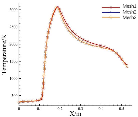 To ensure computational accuracy, hexahedral structured meshes are used for meshing. The liquid oxygen and alcohol injection surfaces and mixing regions are appropriately refined, as shown in Figure 19, with the number of meshes exceeding 500,000. To examine the influence of mesh resolution on the spray combustion process of the air heater, three sets of meshes are divided, named Mesh 1, 2, and 3 respectively. Each set of meshes has dense grid points arranged at the air annulus, liquid oxygen, alcohol injection surfaces, and reaction mixing layers. The number of meshes for Mesh 1, 2, and 3 is 230,000, 500,000, and 1,010,000, respectively [34].