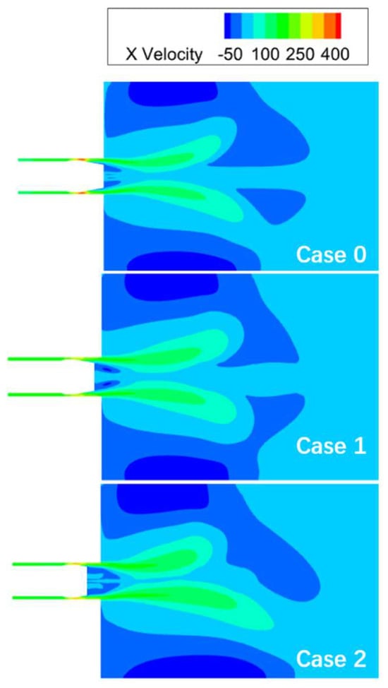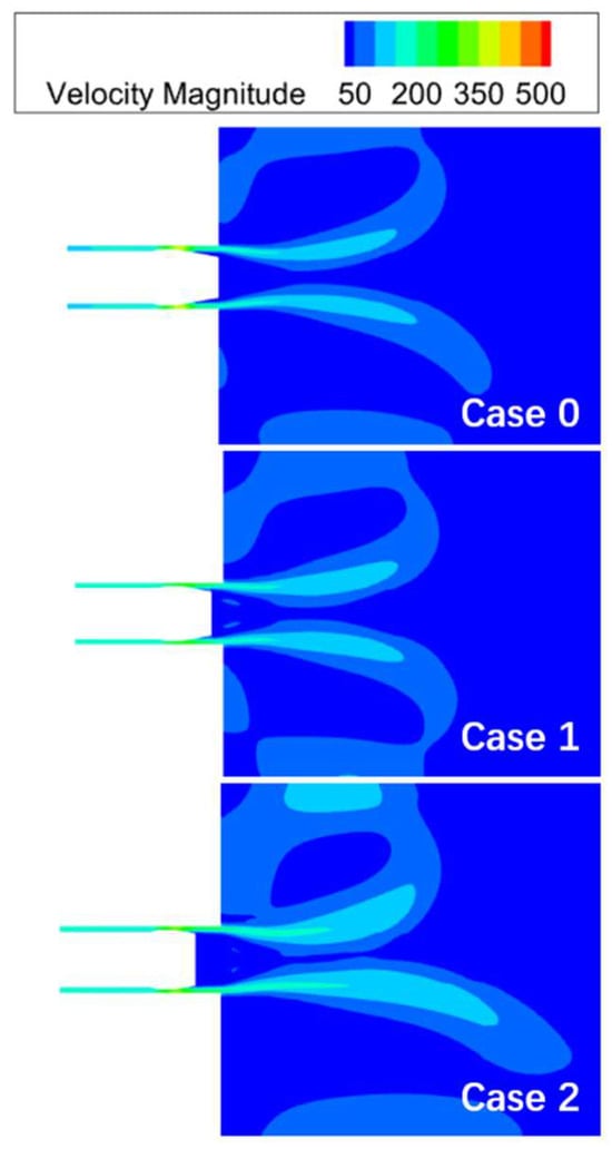 The velocity fields near the injection surfaces of the three sets of injector structures show obvious differences, and their velocity cloud diagrams are shown in Figure 21 and Figure 22. The air jet of the non-recessed injector diffuses directly along the axial direction, the mixing process of fuel and oxidizer depends on the development of the jet itself, and the overall mixing efficiency is low; the recirculation zone of the 5 mm recessed injector is expanded compared with the non-recessed condition, and although the overall velocity field morphology is similar to the non-recessed condition, a local recirculation structure has been formed inside the cavity, and a recirculation vortex appears between the injector panel and the recessed wall surface. The range of the recirculation zone is relatively moderate, which effectively enhances the local mixing effect; the 10 mm recessed injector has a significantly expanded cavity recirculation zone due to the deep cavity design, and the recirculation zones between the injector panel and the upper and lower walls are also obviously enlarged. The deep cavity further strengthens the air flow rotation and velocity gradient, so that the recirculation zone is improved in both spatial range and velocity intensity. The recessed structure can enhance the disturbance effect of the air jet near the injection surface, expand the range of the recirculation zone, and affect the mixing process of fuel and oxidizer. The recessed cavity with recess prolongs the fuel residence time through recirculation, and the larger the recess amount, the more significant the entrainment and mixing effect of the air jet on the fuel, ultimately providing a more sufficient combustible mixture for ignition and combustion.