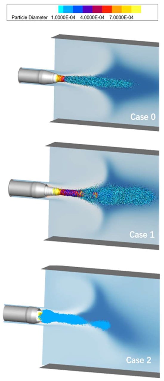 Referring to the cold spray test of recessed injectors in Feng Junhong’s paper [35], Figure 32 and Figure 33 show the SMD (Sauter Mean Diameter) distribution of three different recess sizes at the Z-section of 210 mm and 290 mm. It can be seen that the recess size affects the distribution of particle SMD. The larger the injector recess size, the smaller the SMD. In the figure, the difference between the injector recess of 0 mm and 4.5 mm is not significant, but the recess of 8 mm significantly reduces the SMD. Combined with the above simulation Figure 24 and Figure 26, it is found that near the injector exit, the particle size of the deep cavity injector is obviously smaller, and with the development of the flow field to the downstream, the particle sizes of other injectors are further refined, which is highly consistent with the trend of the cold test SMD curve. This experimental law is intuitively verified in the simulation droplet size distribution diagram: the droplets of the non-recessed and shallow recessed injectors still maintain a large particle size distribution within a long distance after injection, and gradually refine in the relatively far field region; the droplets of the deep recessed injector complete efficient atomization in the near field region, almost all refined into small droplets.