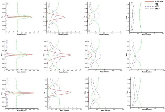 Combined with the mass fraction distribution curves of different flow direction sections in Figure 27, at the near-injection surface section of X = 0.05 m, the alcohol curve and liquid oxygen curve of Case 0 are both concentrated near the axis, with a narrow and steep shape, indicating weak radial diffusion and a narrow mixing interface. The proportions of carbon dioxide and water curves in this section are low, reflecting weak near-field reaction degree; the alcohol and liquid oxygen curves of Case 1 are slightly widened, the mixing region of alcohol and liquid oxygen is expanded, and the reaction process is advanced compared with Case 0; the distribution range of alcohol and liquid oxygen in Case 2 is also narrow, the overall reaction is limited near the axis, but the reaction starts earlier and is more violent. With the development of the flow direction, it can be clearly seen that at the x = 0.15 m plane, the alcohol of the deep recessed injector has completed atomization, while the alcohol distributions of the non-recessed and shallow recessed injectors are similar, the axis-concentrated “strip” shape does not disappear, but the overall tends to be gentle, and the atomization is relatively uniform according to the reaction products at the central axis at this time. The larger the injector recess amount, the faster the radial mixing uniformity of the components improves.