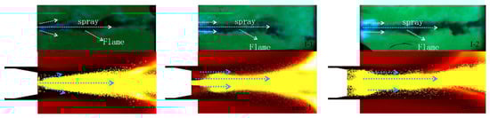 After the blue flame appears at the jet tail, the alcohol pipeline has not yet completed stable pressure build-up, and the spray exit velocity is still at a high level. The high-speed spray flow field strongly purges the flame, causing the flame to be entrained to move downstream and discharged with the nozzle air flow (Figure 10(7),(8)). After 235.43 ms, the flame at the tail of the jet liquid column is stably ignited. The combustion intensity in the recirculation zone continues to increase, and the flame gradually moves upstream under the drive of thermal buoyancy and air flow, propagating along the combustion chamber axis to the injector exit end face, where a large amount of flame accumulates near the injector exit (Figure 10(9),(10)).
