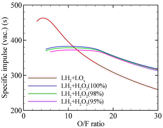 At the oxidizer-to-fuel (O/F) ratio corresponding to maximum performance, the LH2/LOX combination yields a vacuum specific impulse approximately 83.3~93.5 s higher than that of LH2/H2O2 at a chamber pressure of 40 bar. This difference originates from the partially oxidized state of hydrogen peroxide, which reduces the enthalpy of reaction and, consequently, the achievable specific impulse. Furthermore, while the stoichiometric molar ratio of hydrogen to oxidizer decreases from 2:1 with O2 to 1:1 with H2O2, the stoichiometric O/F ratio by mass increases from about 8 to nearly 17. Consequently, although hydrogen peroxide requires a larger oxidizer mass and tank volume, the significant reduction in LH2 tank volume, owing to its extremely low density, may still lead to improvements in the structural coefficient.