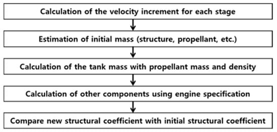 The overall process of the MER calculation is illustrated in Figure 4. The MER calculation estimates component masses based on engine specifications such as thrust, specific impulse, nozzle expansion ratio, combustion chamber pressure, O/F ratio, and propellant density. The initial structural coefficient of the upper stage was set at 0.143, consistent with the third stage of the KSLV-II. Equations (6) and (7) present the regression-based relationships used to estimate the oxidizer and fuel tank masses, derived from empirical correlations in the MER. The regression data are also shown in Figure 5.
