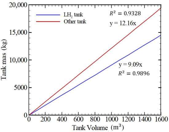 Empirical correlation between tank mass and volume for the LH2 tank (R2 = 0.9896) and other propellant tanks (R2 = 0.9328), adapted from reference [26].