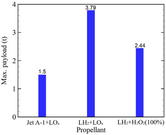 Figure 6 compares the payload capacity for the Jet A-1/LOX baseline, the LH2/LOX and LH2/H2O2 upper-stage options, and a kerosene/LOX reference corresponding to the baseline KSLV-II configuration reported by Korea Aerospace Research Institute (KARI) [26]. KSLV-II is designed to place approximately 1.5 t of payload into a 700 km orbit, and this design point is taken as the performance baseline for the present comparison. The main third-stage parameters of this reference (stage mass, vacuum specific impulse, and structural coefficient) are summarized in Refs. [4,21,27].