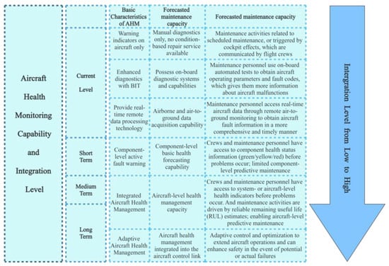 In this context, aircraft health monitoring, as a proactive maintenance strategy, has gradually become a research hotspot, with its capability and integration level ranging from low to high as shown in Figure 3.