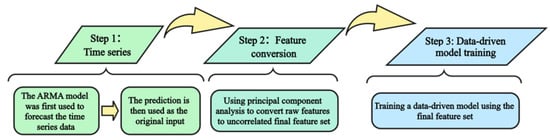 Regression forecasting and advanced machine learning models offer high accuracy. For time series data, Baptista et al. [65] proposed a framework combining an Auto-Regressive Moving Average (ARMA) model with a data-driven technique (Figure 5). The ARMA model predicts the series, whose outputs serve as raw features; these are then transformed via principal component analysis into uncorrelated features for model training. Li [66] improved ARMA by adding a differencing operation, smoothing the sequence and enhancing diagnostic reliability. Li et al. [67] applied the Gaussian Newton iterative method for nonlinear regression of engine baselines, successfully predicting and evaluating engine performance in maintenance. Cao et al. [68] developed a least squares SVM regression model that identified wheezing faults by analyzing relative error rates between real and predicted values of compressor speed, pressure ratio, and fuel flow.