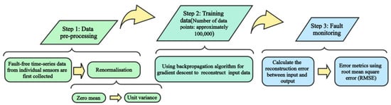 On the other hand, machine learning methods are widely used in fault diagnosis tasks due to their excellent ability in handling nonlinear data. Reddy et al. [69] used Deep Auto Encoder (DAE)-based transfer learning for anomaly detection and fault elimination on aircraft data as shown in Figure 6. The authors proposed leveraging existing unsupervised learning methods based on DAE on raw time series data from multiple sensors to build a robust model for anomaly detection. The anomaly detection algorithm analyzes the reconstruction error of a DAE trained on nominal data scenarios. Based on the reconstruction error between inputs and outputs, fault detection is achieved using the root mean square error as a measure of variance.